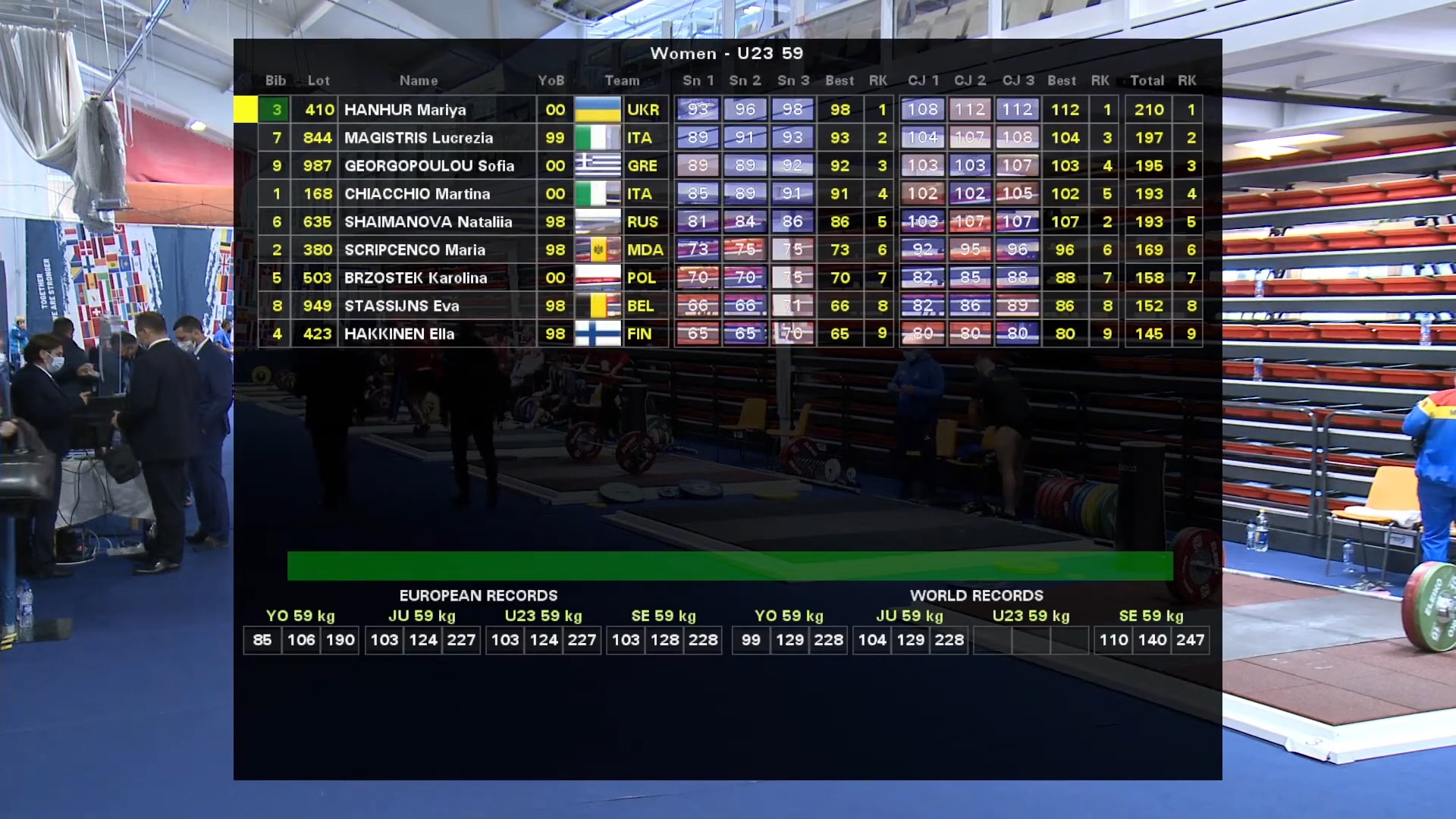 W poniedziałek jako pierwsza wystąpiła Karolina Brzostek, która rywalizowała w kat. 59 kg do lat 23. Reprezentantka Polski zajęła siódme miejsce, uzyskując w dwuboju 158 kg (70+88). Kolejny złoty medal dla Ukrainy zdobyła Mariya Hanhur, z wynikiem 210 kg w dwuboju (98+112).