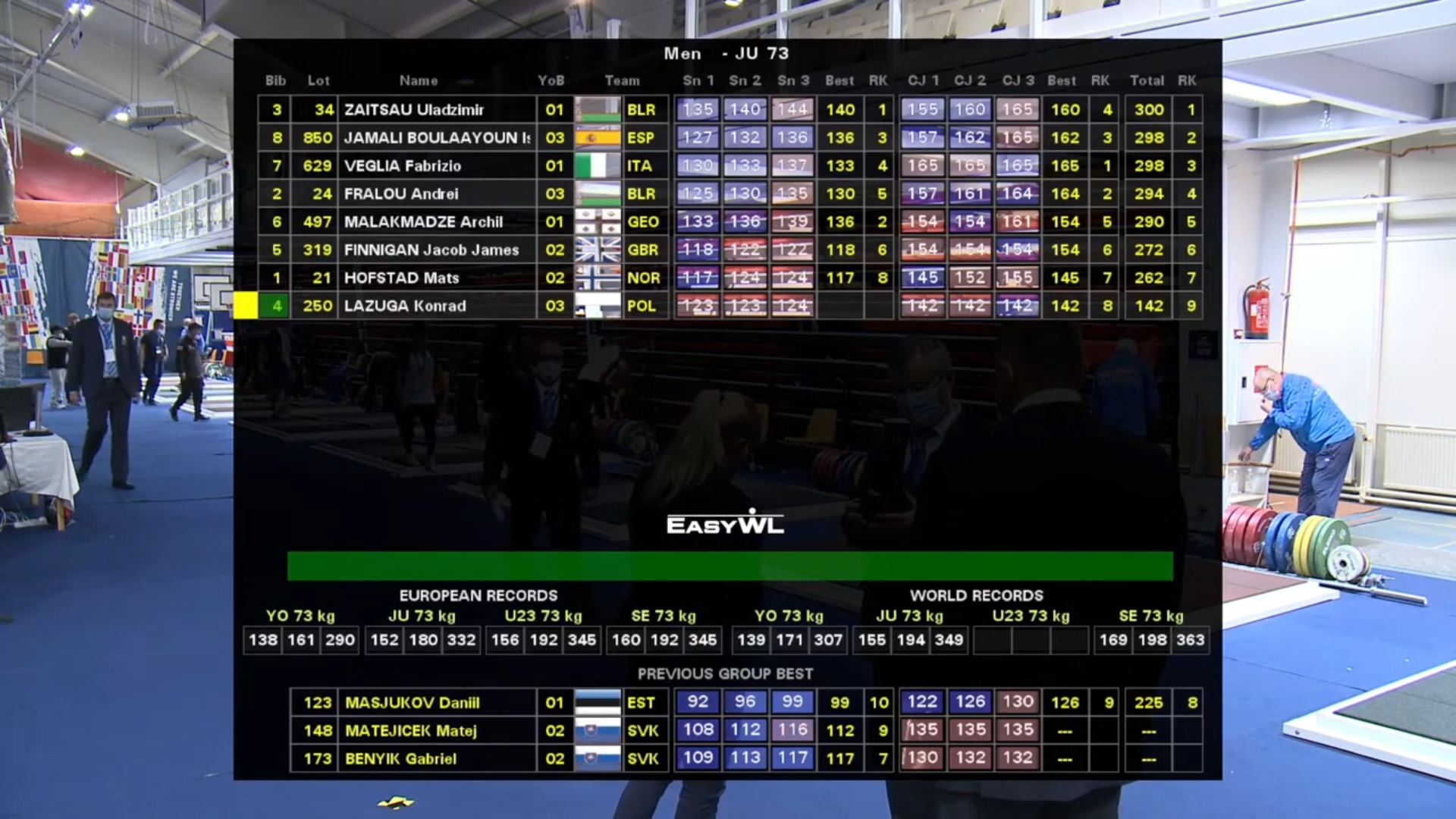 W ostatniej rozgrywanej w poniedziałek kategorii wagowej do 73 kg, wśród juniorów do lat 20 wystąpił Konrad Łazuga. Nasz reprezentant nie zaliczył żadnej próby w rwaniu, dwukrotnie na ciężarze 123 i raz na 124 kg. W podrzucie Konrad dopiero w trzeciej próbie zaliczył podejście 142 kg. Złoty medal dla reprezentanta Białorusi – Uladzimira Zaitsau, który zwyciężył z wynikiem 300 kg (140+160).
