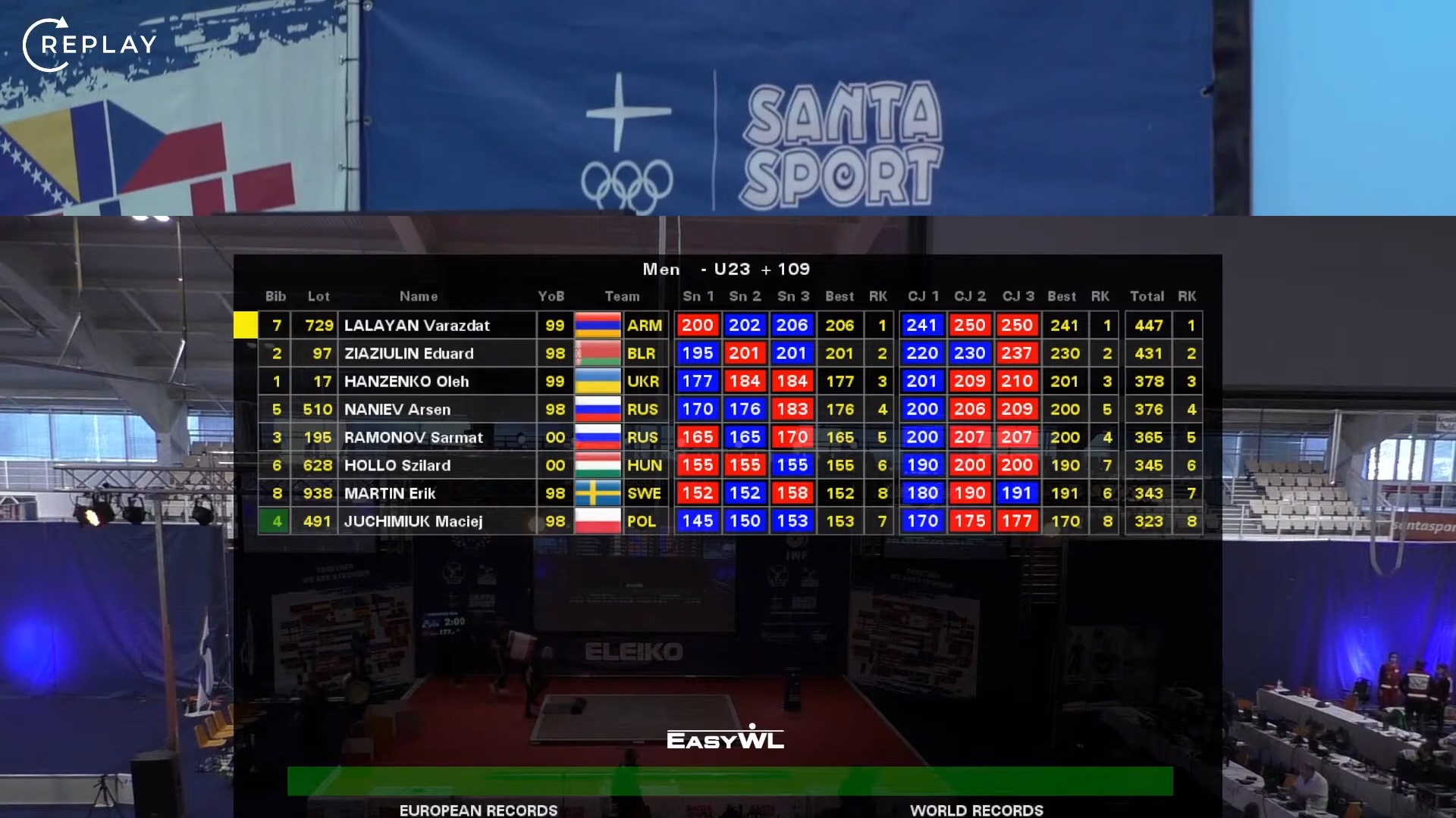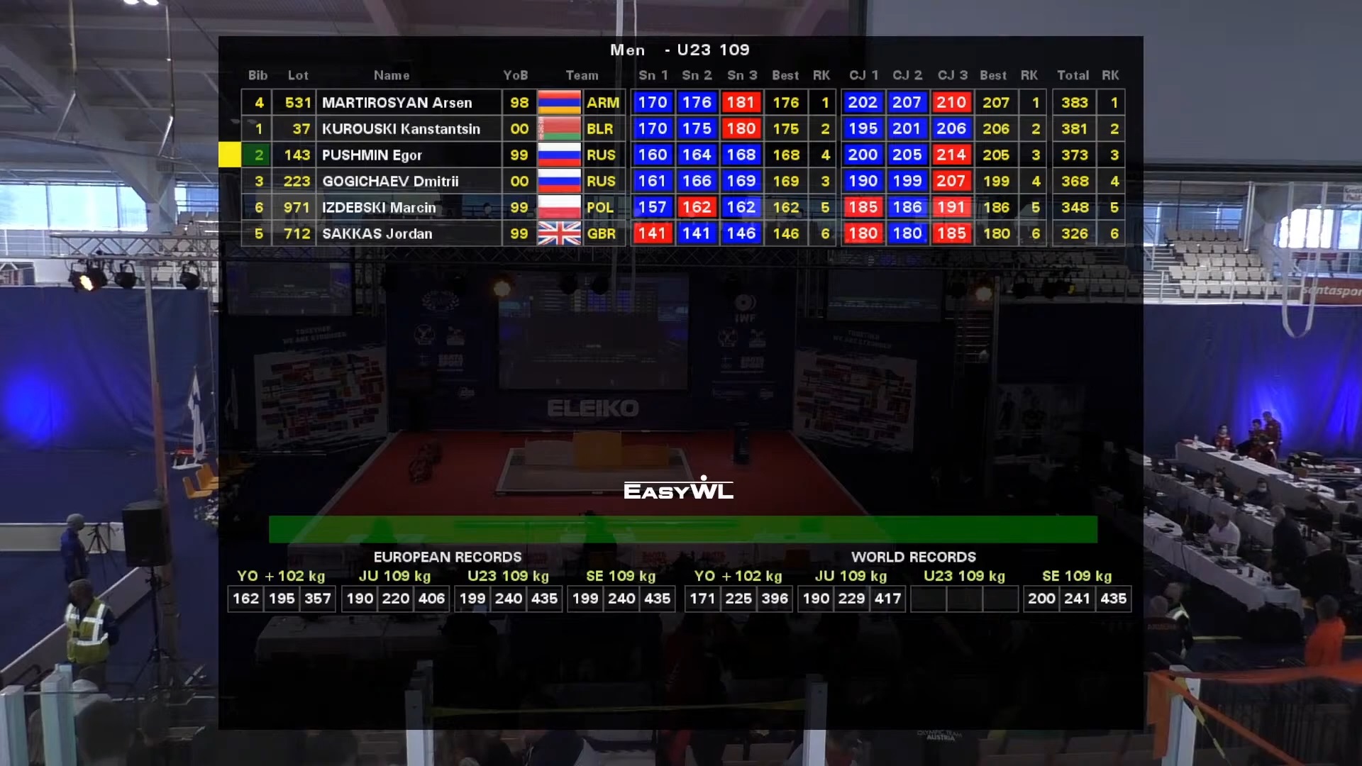 Marcin Izdebski startujący w wadze do 109 kg wśród 23-latków, uplasował się na piątym miejscu. Reprezentant Polski w dwuboju zgromadził 348 kg (162+186). Złoty medal dla reprezentanta Armenii Arsena Martirosyana, który w dwuboju uzyskał 383 kg (176+207).