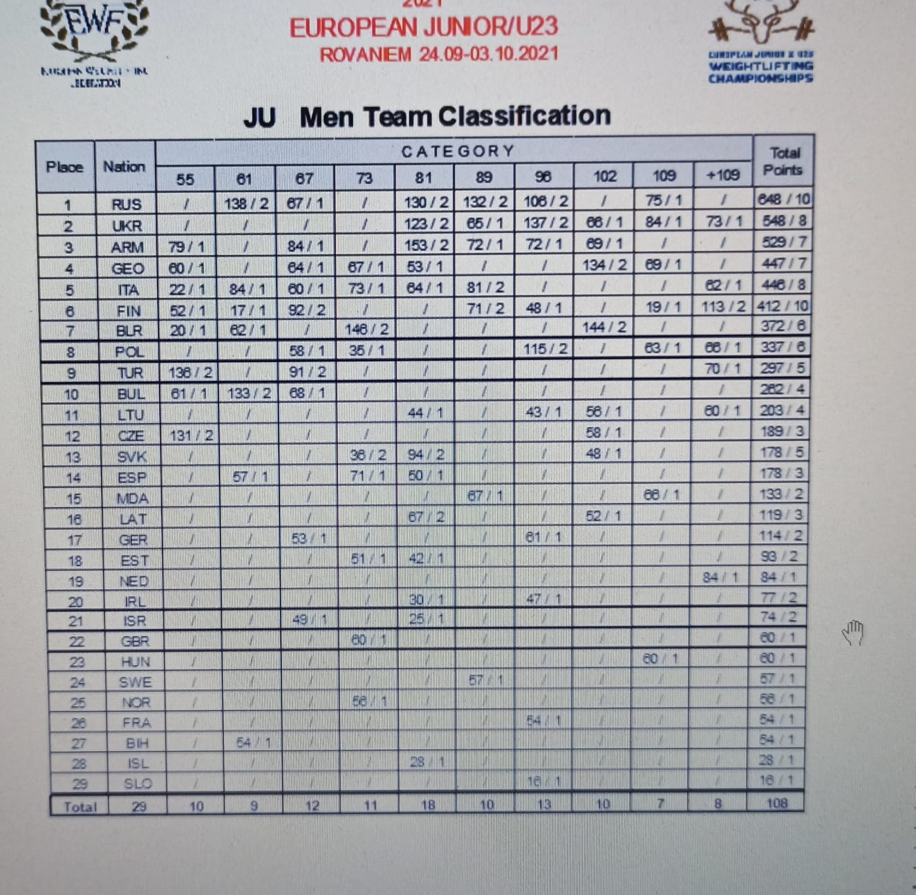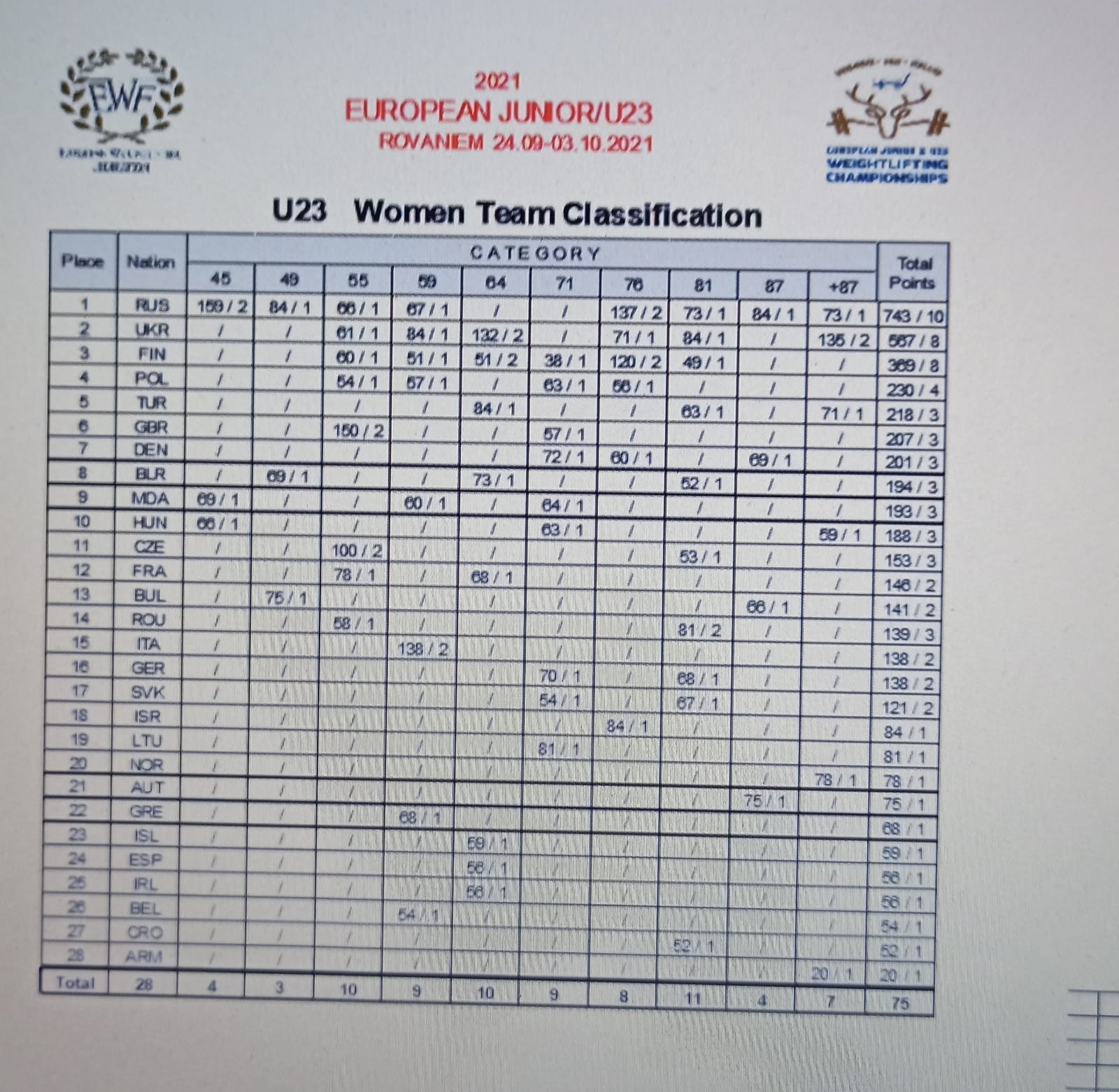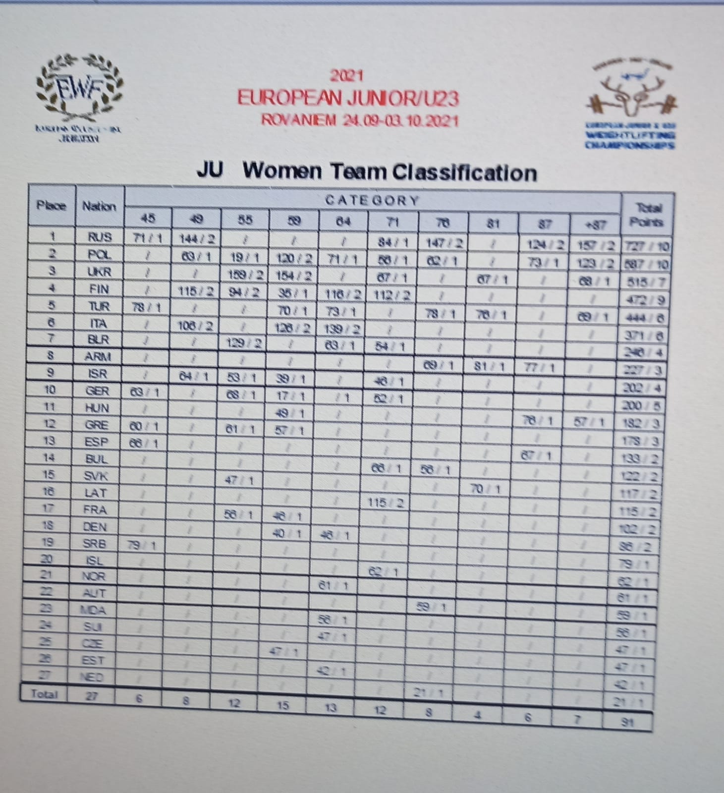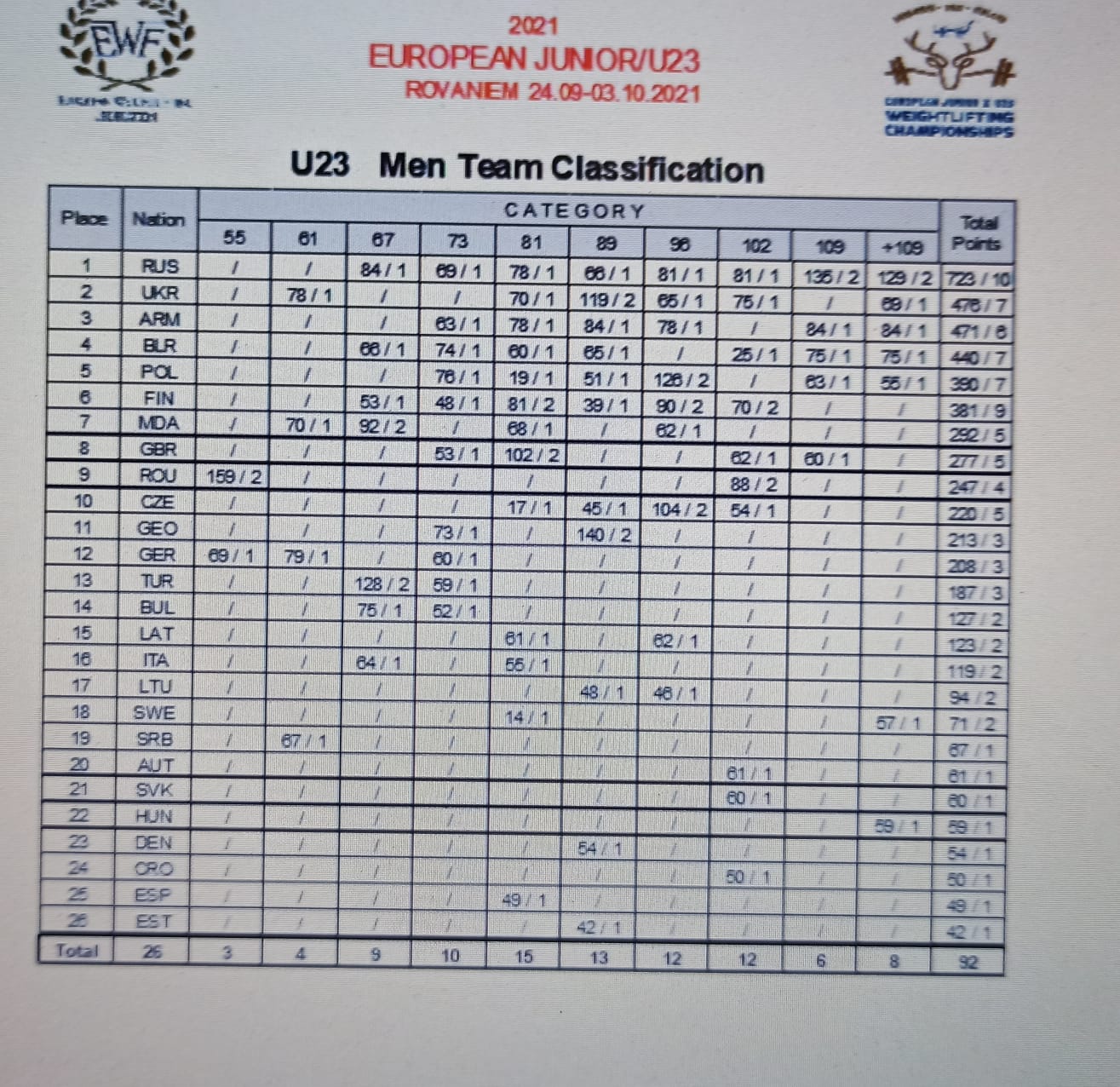 W klasyfikacji drużynowej drugie miejsce zajęły nasze juniorki (587 pkt), ulegając tylko reprezentacji Rosji – 727 pkt. Wśród kobiet do 23 lat reprezentacja Polski sklasyfikowana została na miejscu czwartym – 230 pkt. Najlepsza ponownie Rosja, z dorobkiem 743 pkt. Piąte miejsce w klasyfikacji do lat 23 zajęli nasi panowie, uzyskując 390 pkt. Pierwsze miejsce ponownie Rosjanie – 723 pkt. W grupie U20 ósme miejsce dla naszych juniorów – 337 pkt. Z wynikiem 648 pkt najlepsi Rosjanie, którzy zdominowali wszystkie klasyfikacje punktowe!