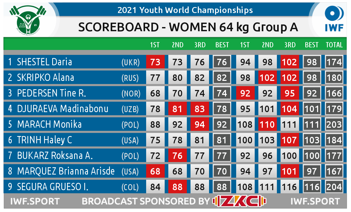 W sobotnie południe, w kategorii 64 kg wystąpiły dwie reprezentantki Polski, Roksana Bukarz i Monika Marach. W rwaniu obie nasze reprezentantki zaliczyły po dwa podejścia. Roksana w pierwszym zaliczyła 72 kg, drugie spaliła na 76, a w trzecim poradziła sobie z ciężarem 77 kg i po rwaniu klasyfikowana była na miejscu szóstym. Monika pierwszymi podejściami zapewniła sobie złoty medal w rwaniu, zaliczając kolejno 88 i 92 kg. Trzecie podejście do ciężaru 94 kg było niestety nieudane.