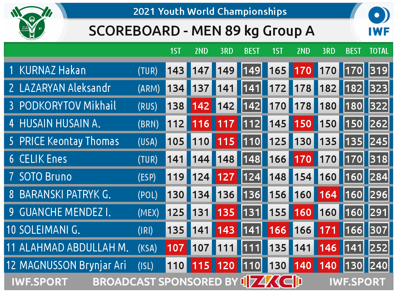 W kolejnej kategorii wagowej – 89 kg, rozgrywanej podczas mistrzostw świata do lat 17 w podnoszeniu ciężarów, odbywających się w Jeddah (Arabia Saudyjska), wystąpił Patryk Barański. Reprezentant Polski w rwaniu zaliczył wszystkie trzy podejścia, kolejno do ciężarów 130, 134 i 136 kg i zajmując w tym boju szóste miejsce. W podrzucie zawodnik z Dobryszyc miał dwie udane próby na ciężarach 156 i 160 kg. Trzecie podejście do sztangi ważącej 164 kg było niestety nieudane. Patryk rywalizację zakończył ostatecznie na miejscu szóstym, z wynikiem 296 kg w dwuboju. Gratulacje! Złoty medal w tej kategorii wagowej wywalczył Ormianin Aleksandr LAZARYAN, z rezultatem 323 kg (141+182).