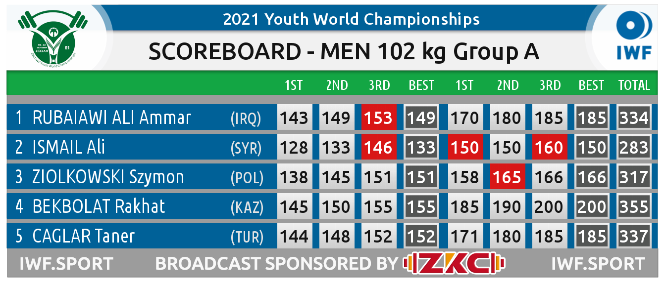 W ostatniej kategorii wagowej, z udziałem naszego reprezentanta, wystąpił Szymon Ziółkowski. Zawodnik z Ciechanowa zaliczył wszystkie podejścia w rwaniu – 138, 145 i 151 kg, zdobywając brązowy medal w tym boju oraz poprawiając rekord Polski do lat 17! W podrzucie jednak rywale okazali się silniejsi. Nasz reprezentant w pierwszym podejściu poradził sobie z ciężarem 158 kg. W drugiej próbie niestety spalił 165, ale po dołożeniu jednego kilograma, ukończył podrzut z wynikiem 166 kg. Szymon z wynikiem 317 kg w dwuboju ostatecznie znalazł się tuż za podium, tracąc do trzeciego miejsca 17 kg. Tytuł mistrza świata w tej wadze wywalczył reprezentant Kazachstanu Rakhat Bekbolat, z rezultatem 355 kg (155+200).