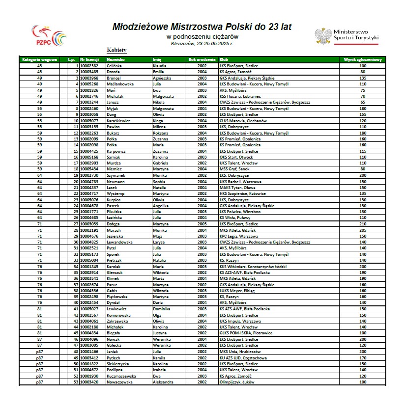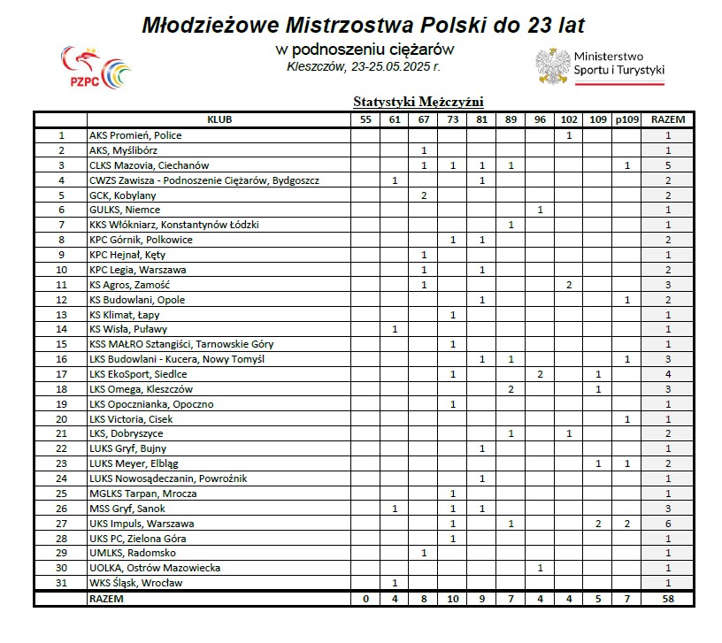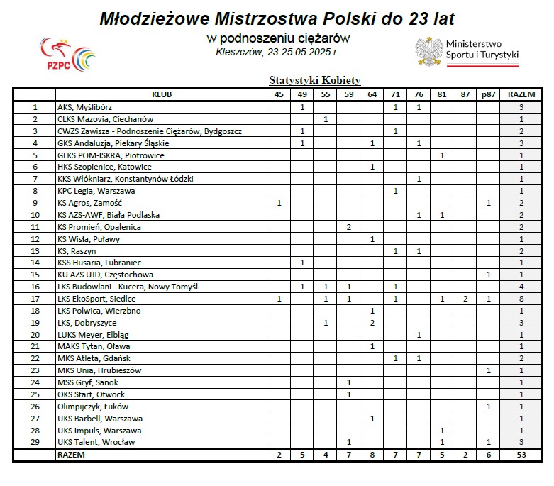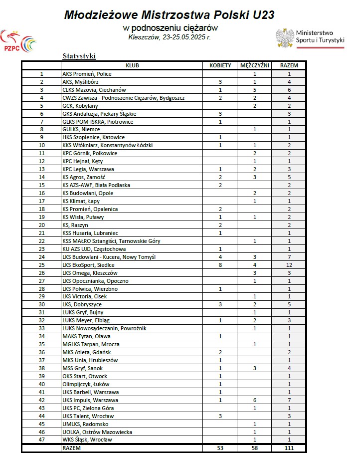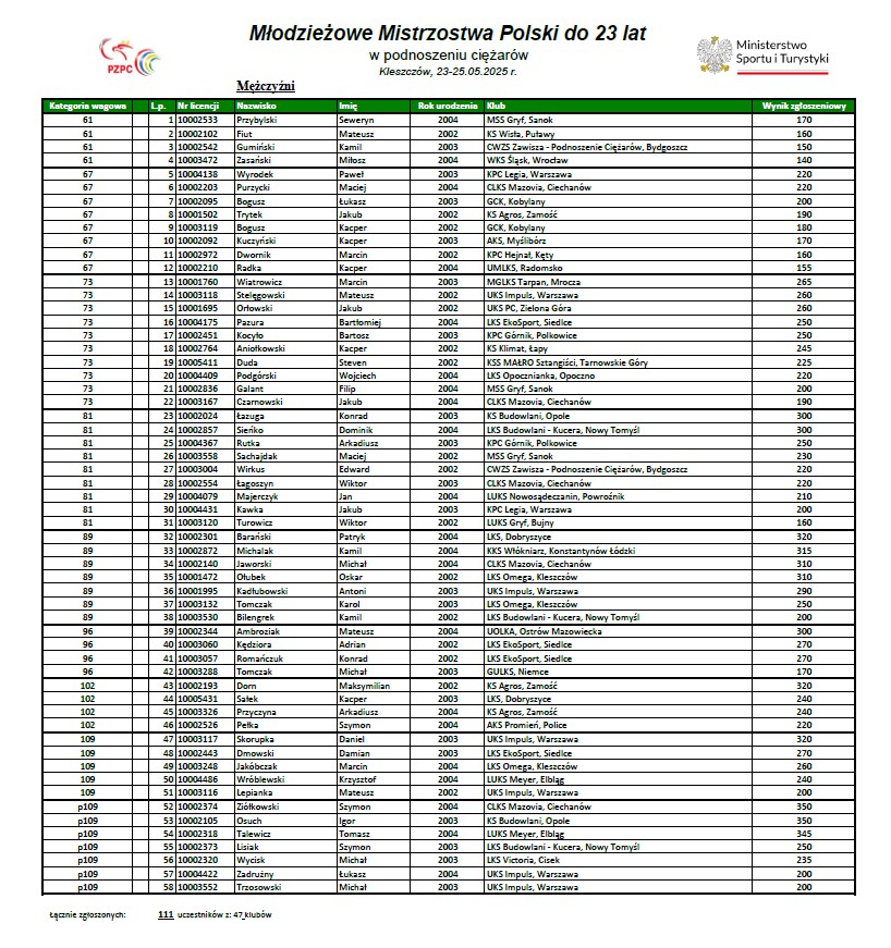 Prezentujemy statystyki oraz list startowe kobiet i mężczyzn. Wśród pań mamy 53 zawodniczki z 29 klubów, wśród młodzieżowców 58 zawodników z 31 klubów. Na najlepszych czekają atrakcyjne medale! Historyczne - bo z "grawerką" 100 lat PZPC 1925-2025!!! Prezentujemy listy startowe oraz statystki związane z MP U23 2025! Zapraszamy do Kleszczowa w dniach 23-25 maja 2025!