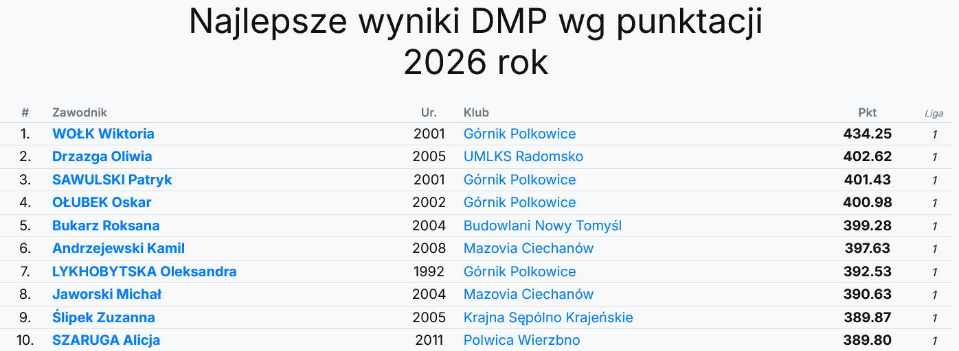 Najlepsze wyniki indywidulanie: Wiktoria Wołk (KPC Górnik Polkowice) 268,76 pkt; Patryk Sawulski (KPC Górnik Polkowice) 401,43 pkt. Punktacja ligowa - Wiktoria Wołk - 434,25 pkt (najlepszy rezultat I rundy).
