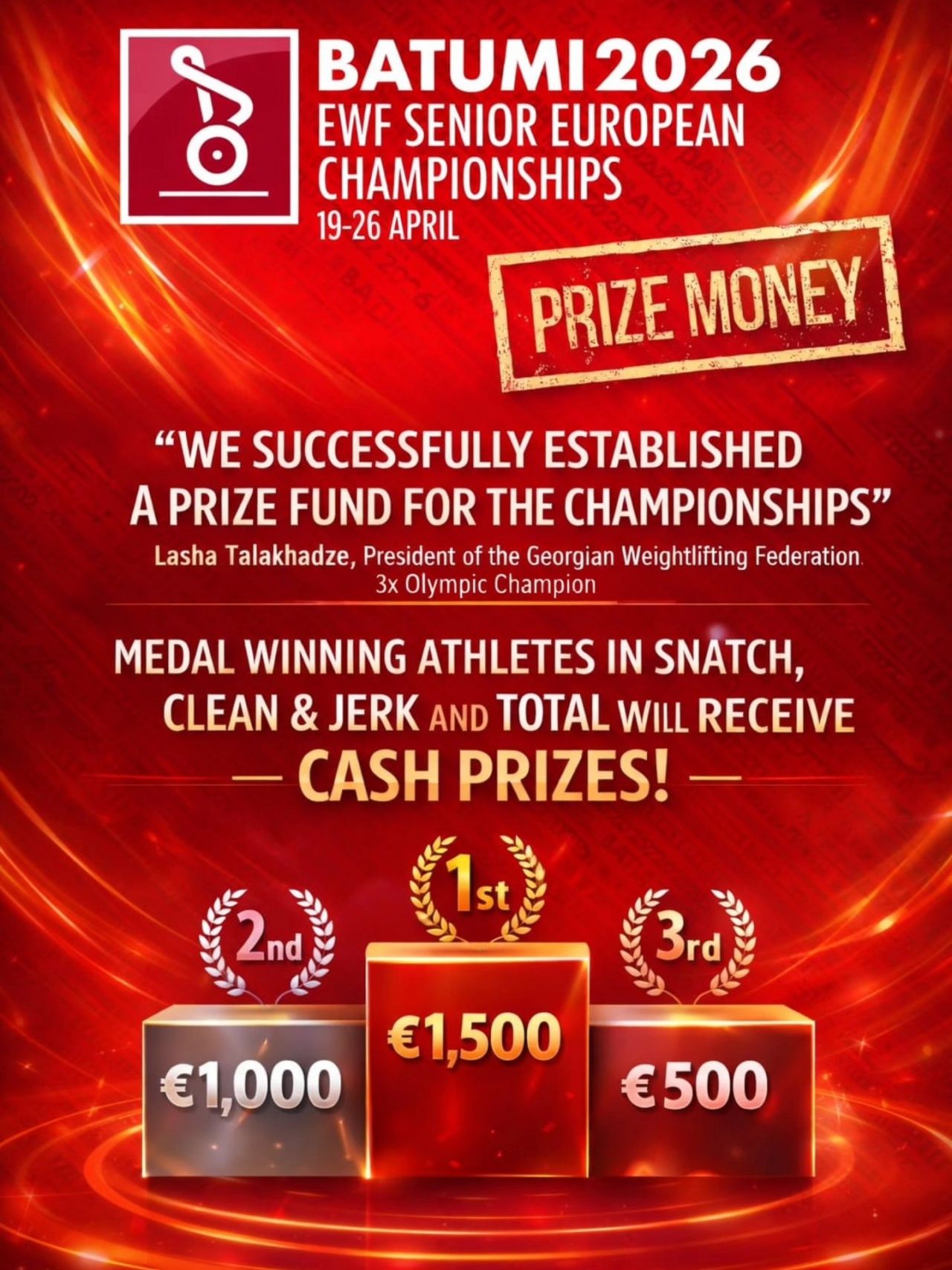 Od 19 kwietnia Batumi po raz drugi w swojej historii, gościć będzie najsilniejszych ludzi Europy w podnoszeniu ciężarów. W dniach 19-26 kwietnia 2026, w drugim co wielkości mieście Gruzji, odbędą się mistrzostwa Europy seniorek i seniorów. Gospodarze poinformowali o nagrodach finansowych, jakie przygotowali dla medalistów – 1500 euro za złoto w dwuboju, rwaniu i podrzucie, za srebro – 1000 i 500 za brąz. Tego wcześniej nie było! Brawo Gruzińska Federacja Podnoszenia Ciężarów.